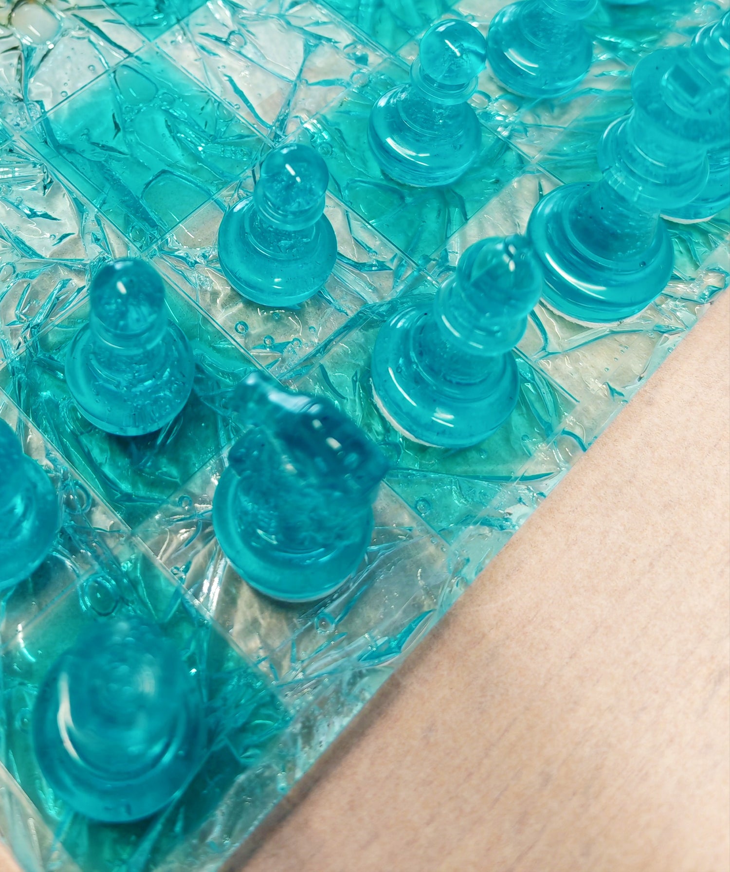 Échiquier en résine époxy style glace avec une case sur deux plus foncé pour pouvoir y jouer.