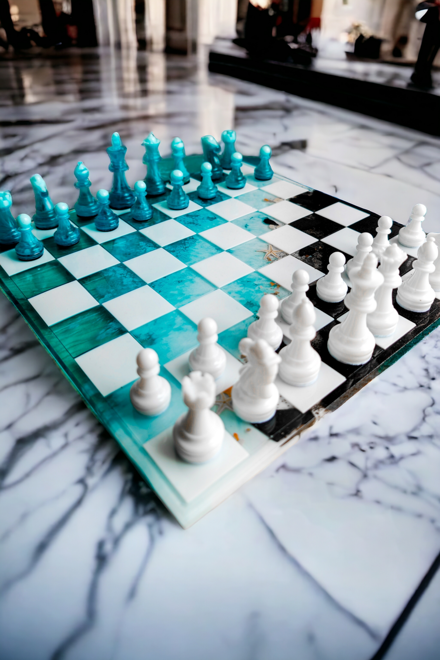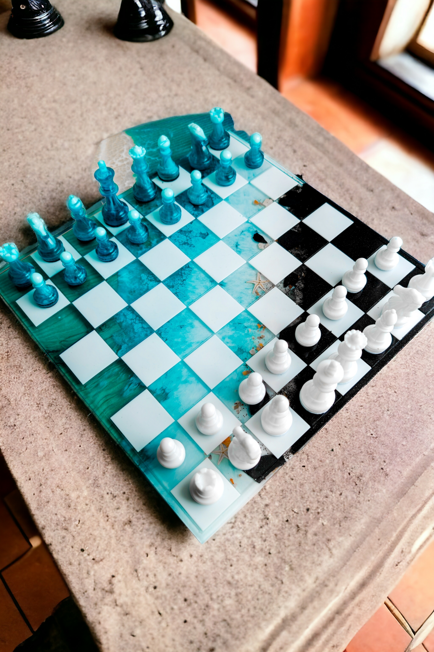 Échiquier en résine époxy style océan avec plage noir.