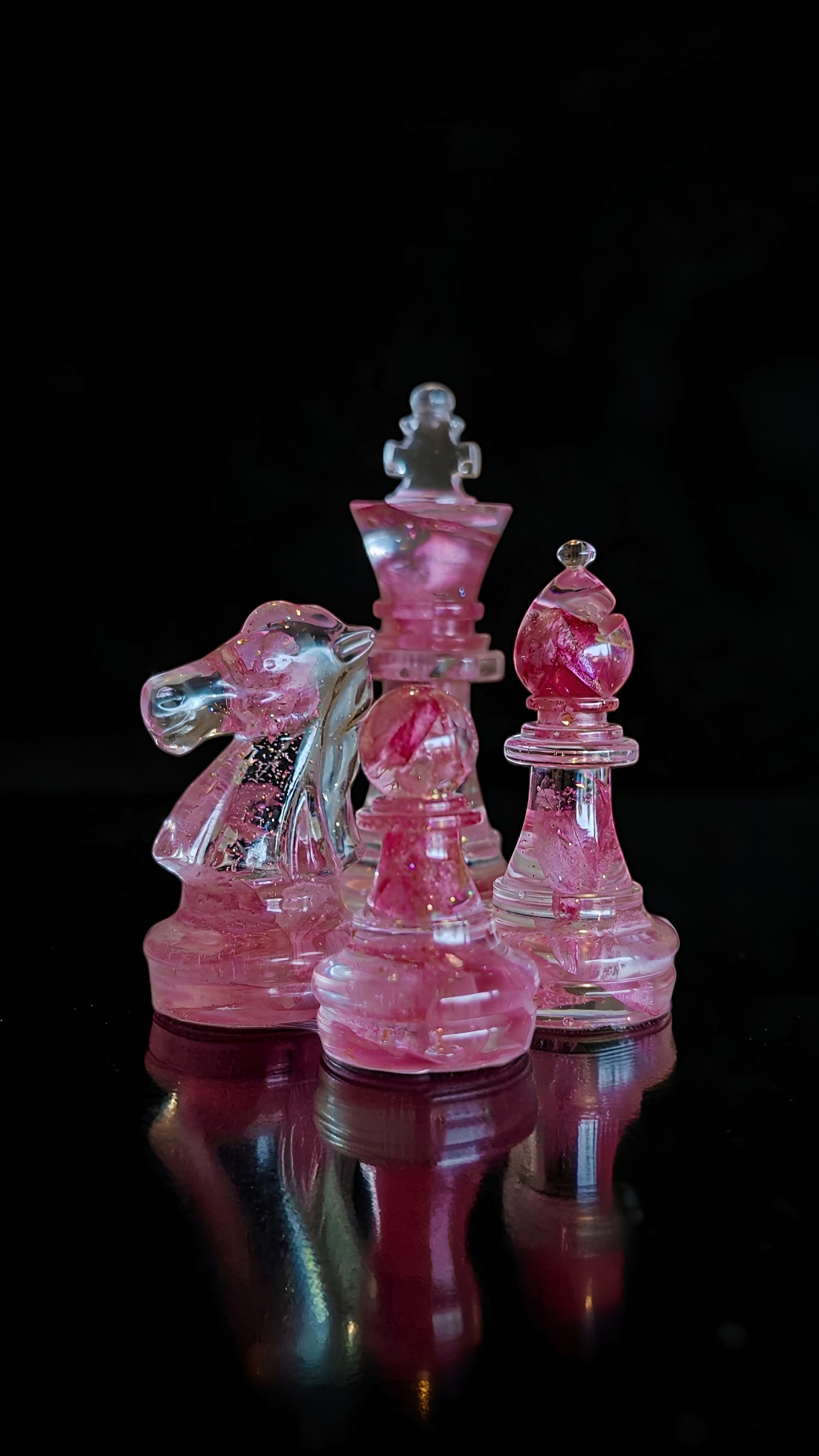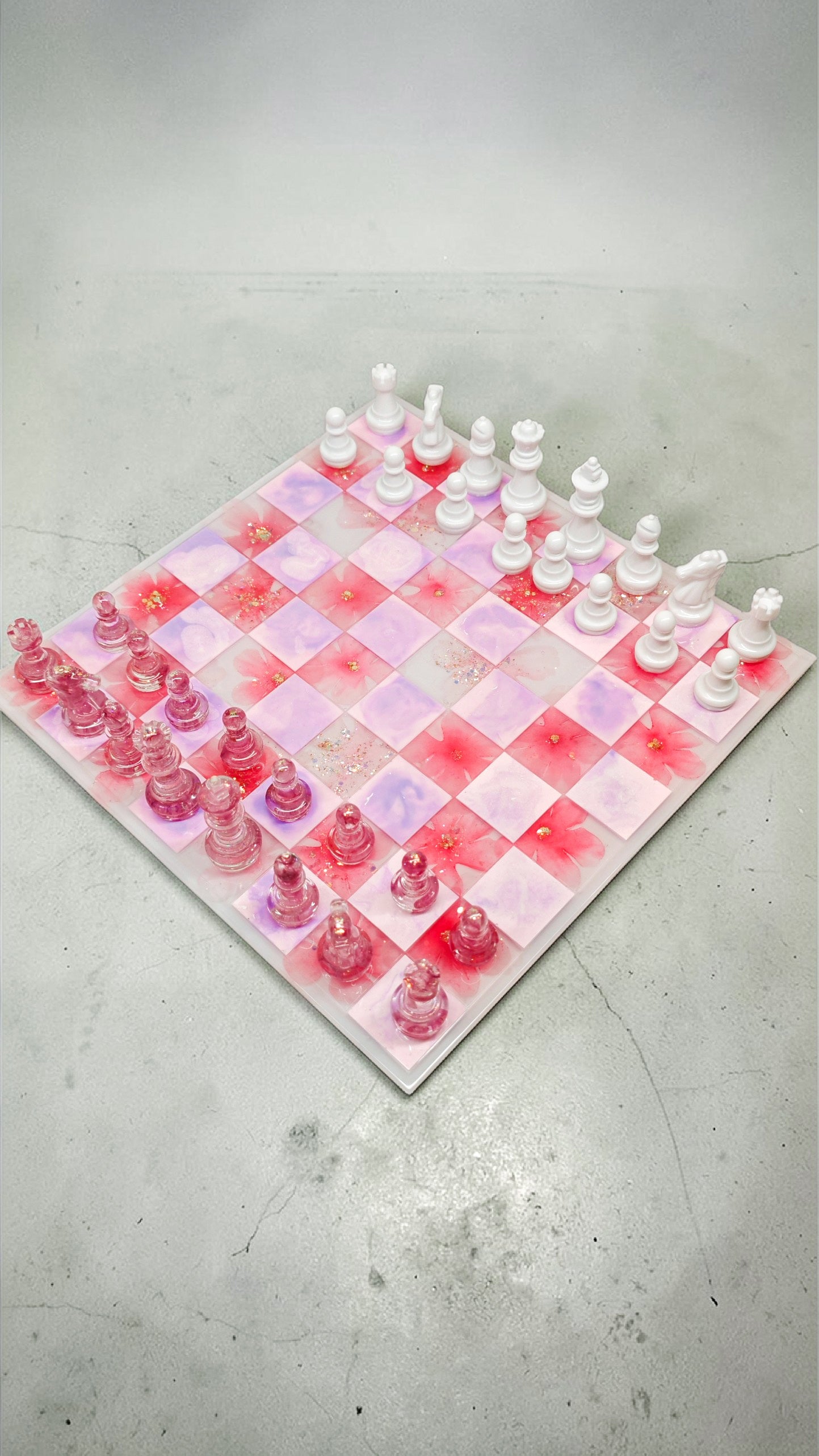 Échiquier thème Sakura en résine époxy, fleurs artificielles et fleurs naturelles.